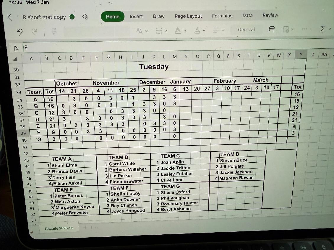 6TH JAN. A V E 15 - 14. B V D. 19 - 8. G V F. 10 -21